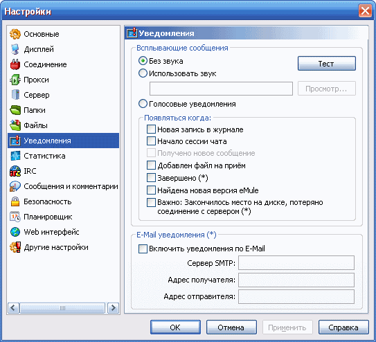 Это сервер, отвечающий за рассылку почты. Обычно не бывает локально запускаемого сервера SMTP, поэтому следует обеспечить или сервер Интернет-провайдера, или какой-либо бесплатный почтовый сервер, подобно GMX. Большинство серверов SMTP для рассылки почты потребуют идентификации (имя пользователя и пароль). Это делается с целью защиты сервера от злоупотреблений спаммерами. В настоящее время eMule еще не предлагает возможность предоставления информации об идентификации серверу SMTP.